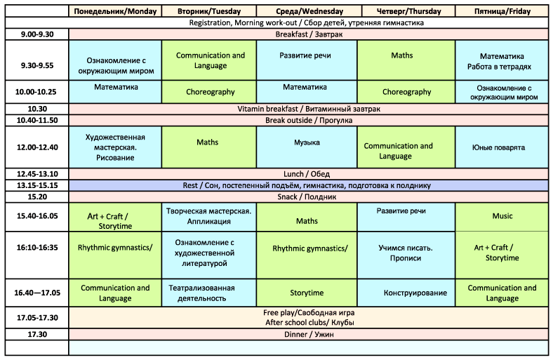 • Занятия: обучение будет проходить пол дня на Pin-Up языке, пол дня на английском, включая: Развитие речи, Азбуку, Математику, Окружающий мир, Музыку, Физкультуру, Art and Craft, Maths, Communication and Language, Storytime, Music. (Дополнительно в файле распорядок дня, расписание будет еще немного корректироваться).